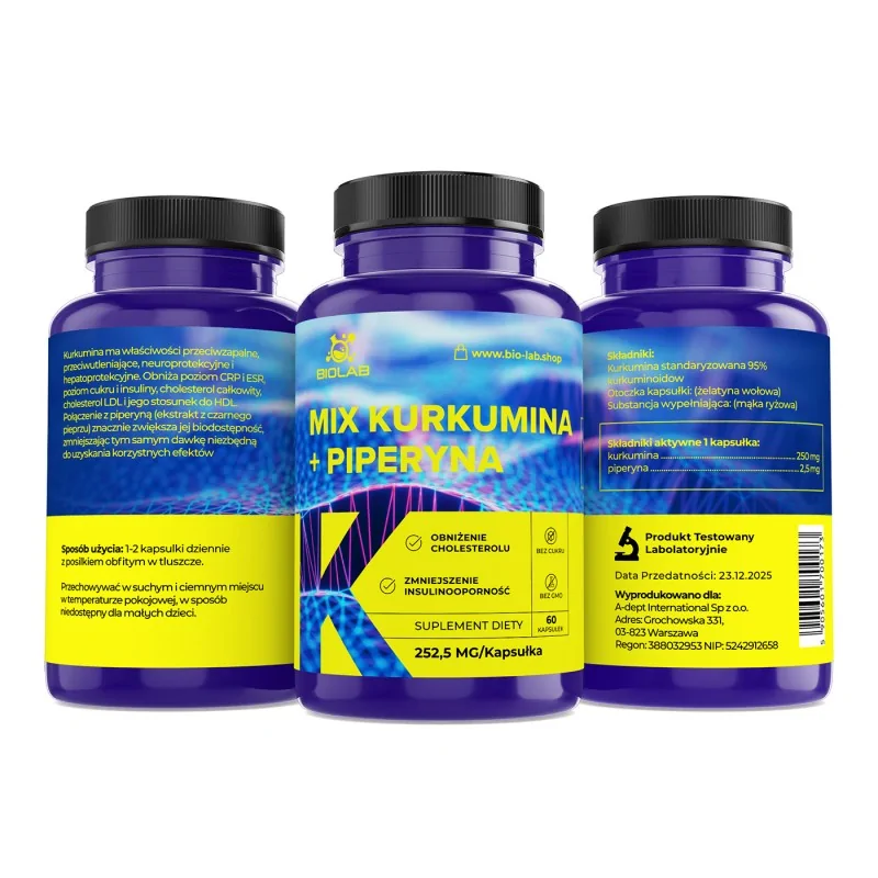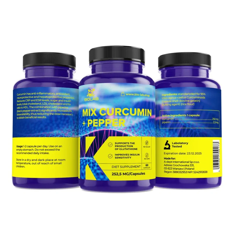 Sinergia de ingredientes: La combinación de curcumina y piperina es particularmente eficaz porque la piperina puede aumentar la biodisponibilidad de la curcumina, lo que potencia sus efectos. Así, estos ingredientes actúan de forma sinérgica, lo que los hace aún más eficaces. La curcumina y la piperina son complementos que pueden contribuir a un estilo de vida saludable. Gracias a su acción sinérgica, son una excelente opción para quienes desean enriquecer su dieta con ingredientes naturales.